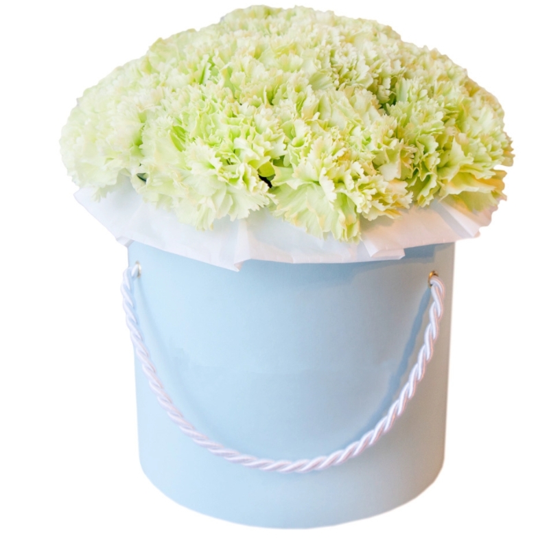 Букет состоит из 25 зеленых гвоздик, коробка, оазис.