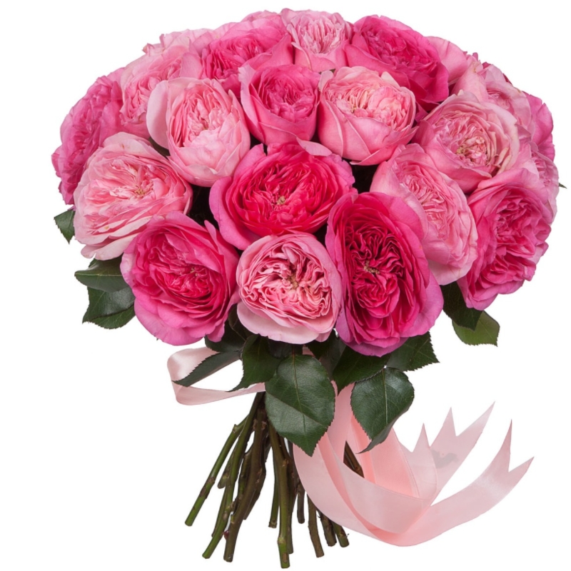Букет состоит из MIX из 25 пионовидных роз, прозрачная упаковка, атласная лента.
